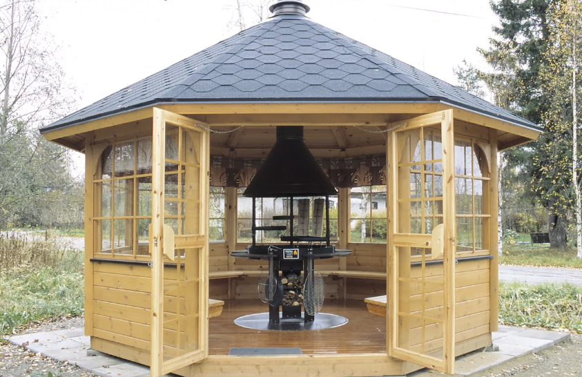 Такие беседки категорически запрещено размещать вблизи деревьев и деревянных сооружений. Место соприкосновения трубы с кровлей крыши необходимо отгородить асбестовым листом или нитью, а все деревянные элементы покрыть защитной жаростойкой пропиткой.