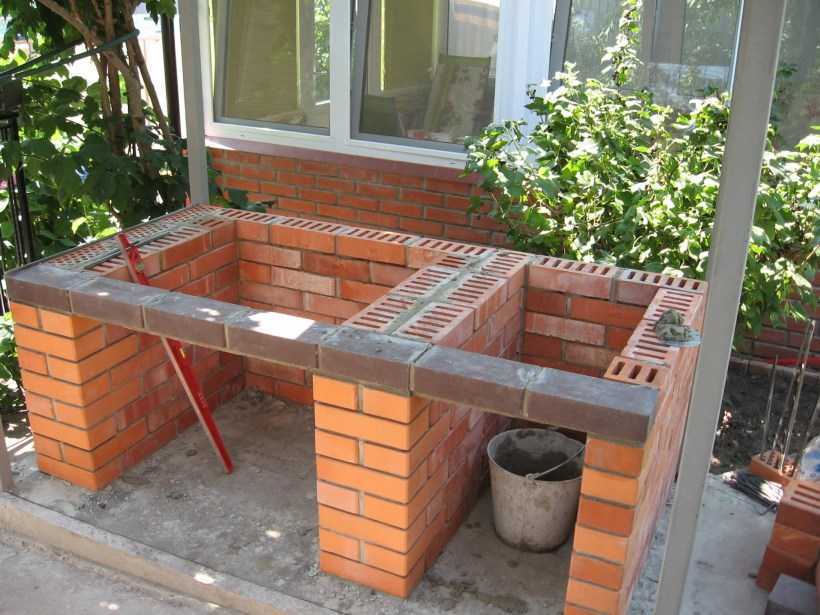 Если строится стол на стороне мангала, то нужно расположить кирпичи в форме буквы «Е», чтобы центральная стена поддерживала мангал и стол.