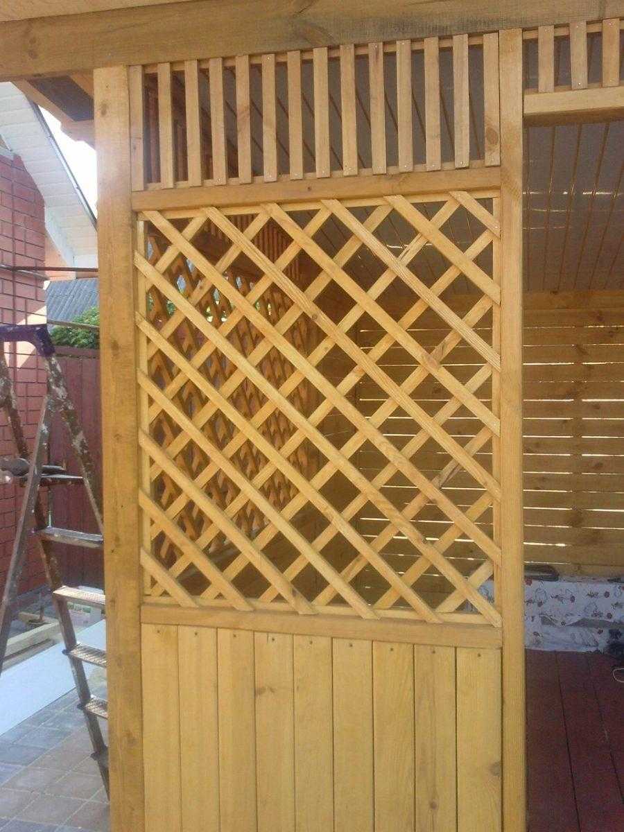 Если вы приняли решение сделать беседку с непрозрачной обшивкой до уровня обвязки, то рекомендуется устанавливать стационарные укосины. Их длина всего пятнадцать сантиметров, но они значительно укрепят готовую постройку. С одной из сторон квадратной или прямоугольной беседки, должен быть вход. Конструируется он на расстоянии не более шестидесяти сантиметров от угловых стоек. Ширина проема должна быть около 81 см.