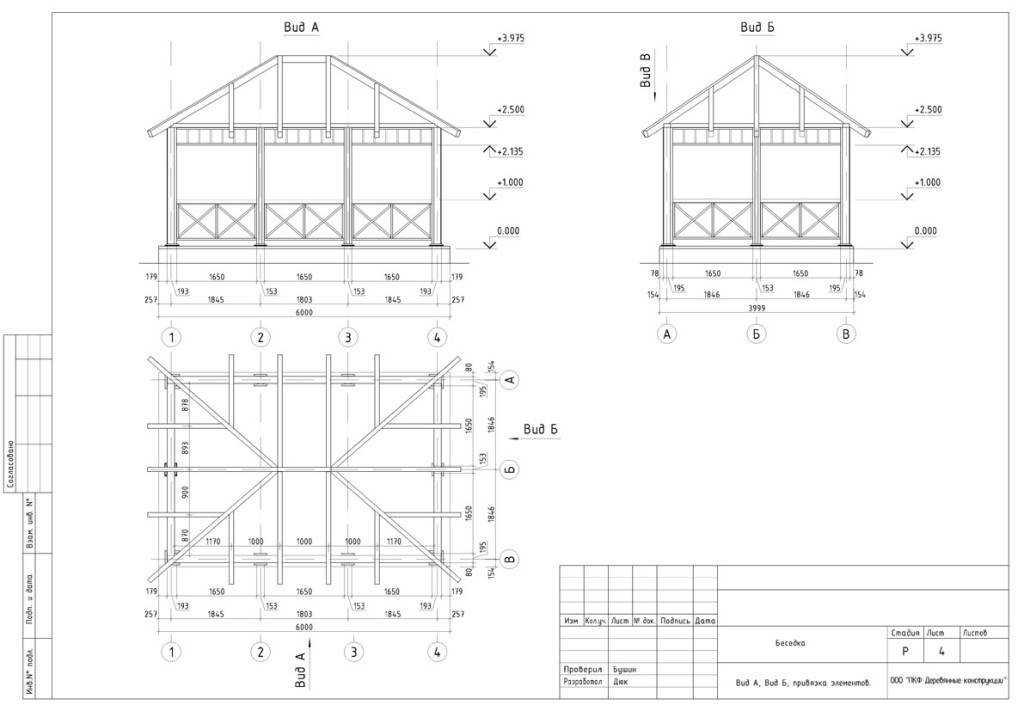 Поскольку для создания беседки будут использованы различные крепёжные элементы в виде металлических уголков, то подробный проект поможет посчитать количество и виды этих уголков. Пример такого проекта показан на фото выше.