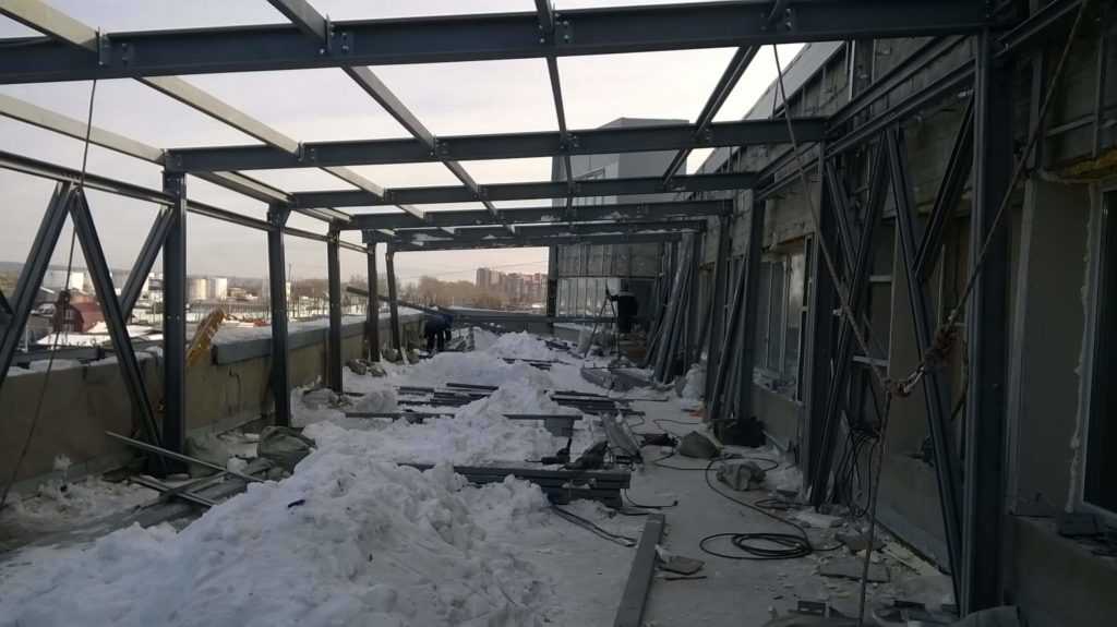 При устройстве первого типа стоечные фасадные профили устанавливаются на 30–50 см выше расположенных на задней панели для последующего устройства уклона крыши. Для двухскатной кровли необходима сборка стропильной системы.