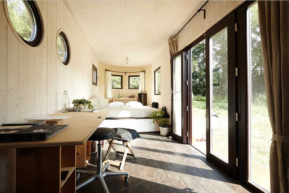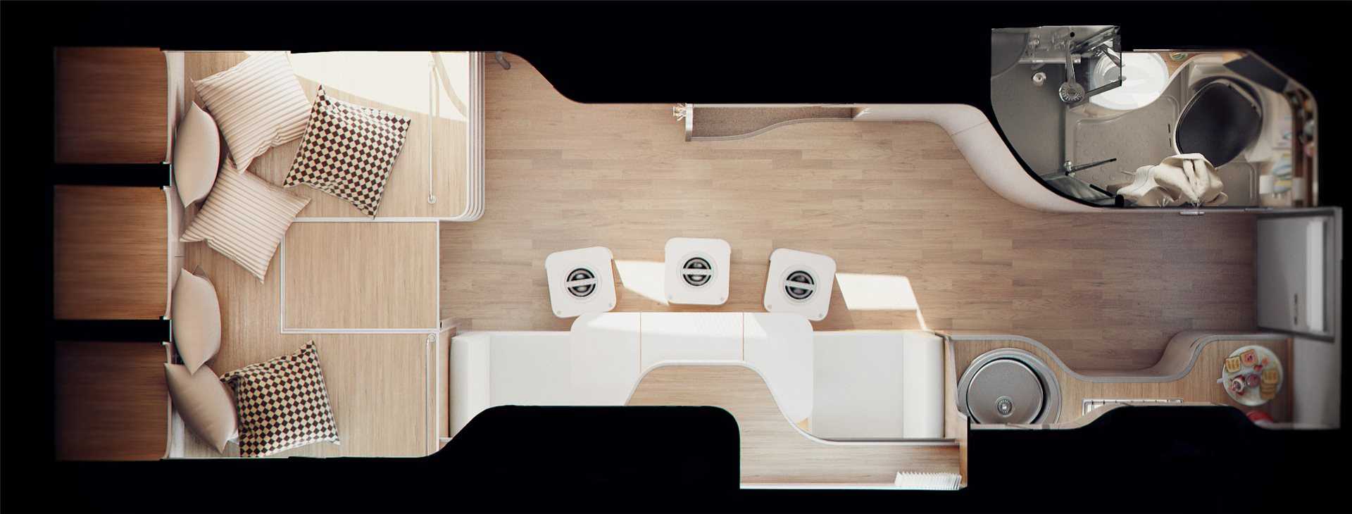 Дом имеет фиксированное водительское место с большим лобовым стеклом для лучшего обзора дороги и окружающего ландшафта. Внутренние стены могут выдвигаться, образуя, таким образом, различные зоны или дополнительные спальные места.