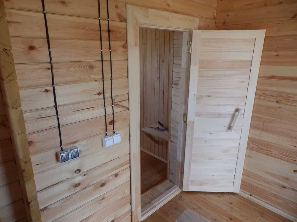 Парилка. В парной идеальный вариант клиновая деревянная дверь (на планках тонкие доски, что нежелательно, хотя промышленность предлагает и такой вариант под названием «ласточкин хвост»). Стоит практически во всех деревенских баньках. В современных постройках стало появляться стекло. Стоит избегать металла — обжигает и поливинилхлорида — выделяет вредные вещества при нагревании.