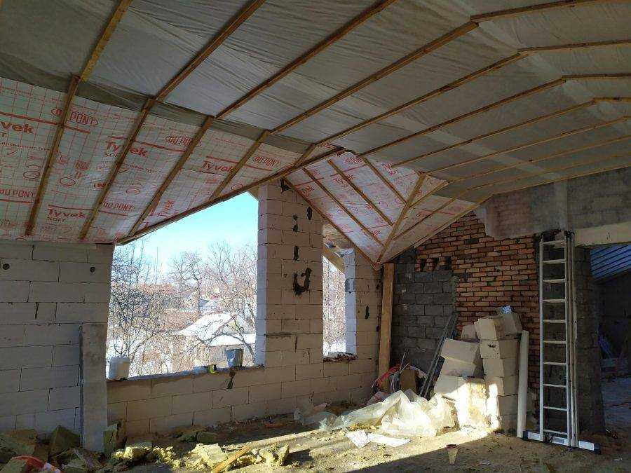 - На заключительном этапе формируют слой пароизоляции, чтобы не допустить проникновения пара на конструкцию двускатной крыши. Фиксацию материала осуществляют внахлест с применением строительного степлера. Все стыки закрываются специальной лентой.