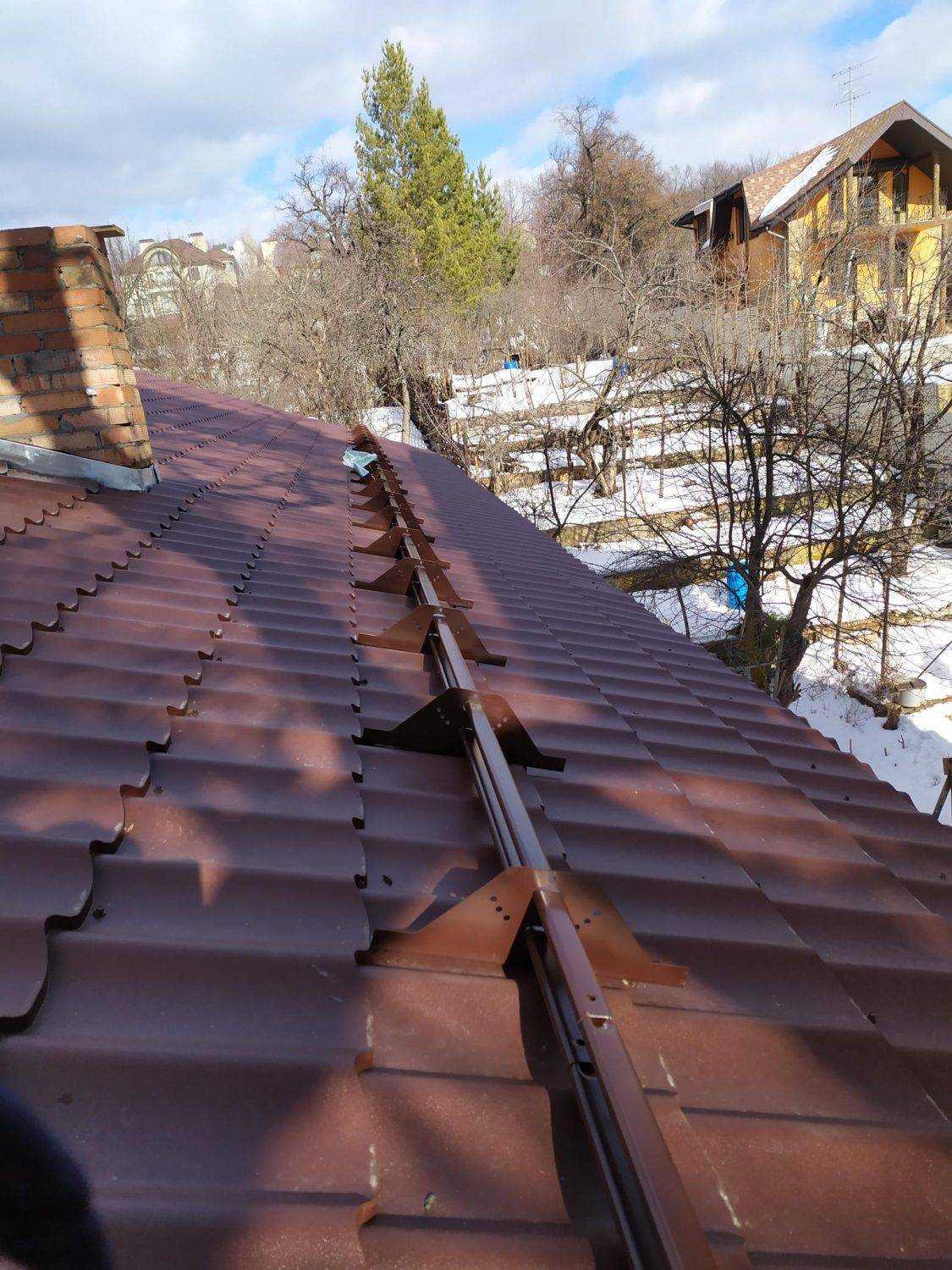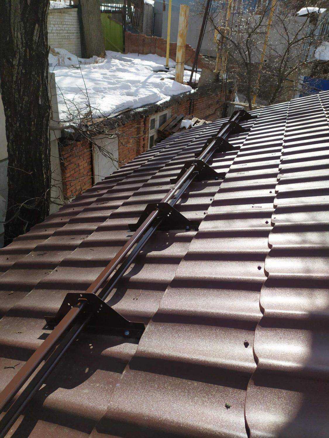 После выполнения каркаса крыши требуется выполнить установку вспомогательных крепежей для улучшения жесткости кровли. Для этого устанавливают подкосы и средние коньки.