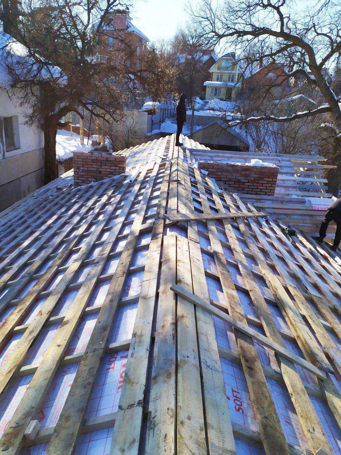 После установки обрешетки крыша накрывается слоем гидроизоляции, слои которой монтируются с напуском друг на друга, а стыки скрепляются скотчем.