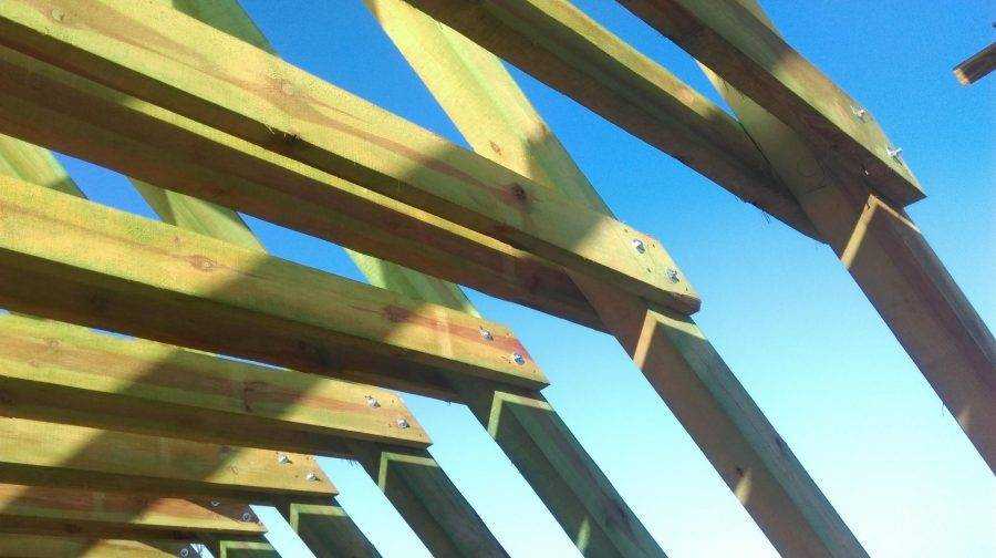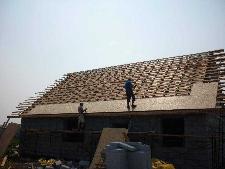 После того как установлены распорки и укосы, временный крепеж удаляется. На следующем этапе на стропильную систему накладывается обрешетка.