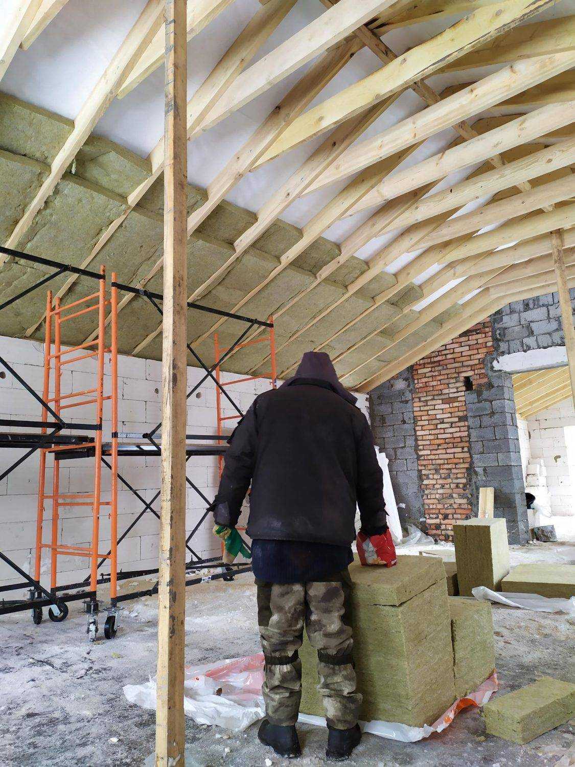 - Далее проводится укладка теплоизоляционного слоя. Качественный материал обеспечит удержание тепла под крышей в холодный период и не даст быстро проникнуть жаре в летний зной. Монтаж утеплителя проводится между стропилами, его функции выполняют материалы с содержанием минеральной ваты.