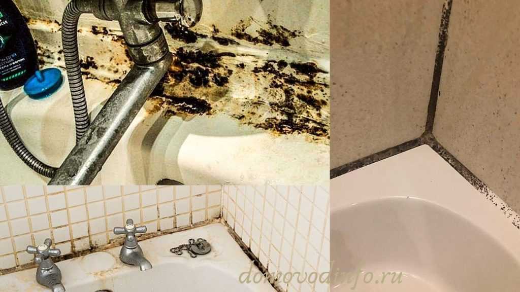В ванной плесень на стенах часто появляется на межплиточных швах или на стыках между стенами и сантехникой. Для уничтожения черного налета вокруг плиток пораженные места сначала счищают металлическим скребком, затем покрывают антисептической затиркой.