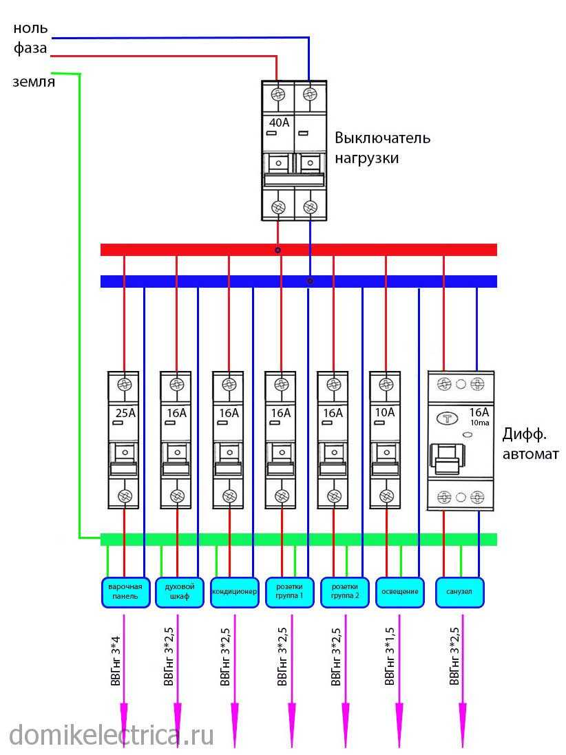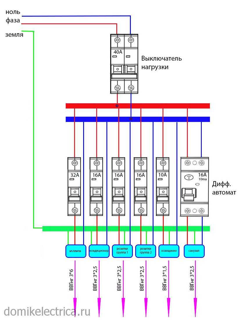 На рисунке выше изображена распространенная схема подключения автоматов обычной квартиры. Перед счетчиком устанавливается главный двухполюсный ввод, затем подключается противопожарное УЗО (слева направо), а за ним делается разводка по потребителям с однополюсными автоматами. Красным цветом обозначается фаза, синим – ноль, а коричневым – заземление. Шины нулевого провода и земли подключены отдельно.