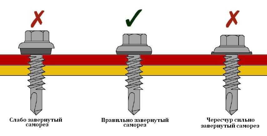 Нужно четко соблюдать глубину вкручивания самореза. Лучше всего смотреть по резиновой прокладке: если она выглядывает на 1-2 мм от поверхности крыши, значит, саморез был вкручен правильно.