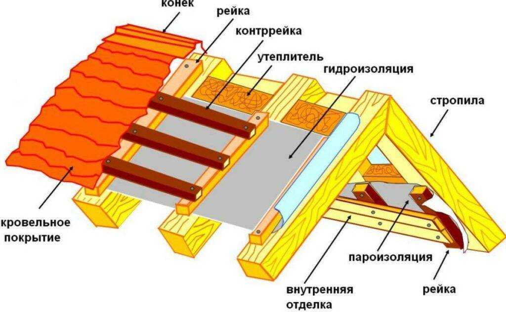 Любая кровля имеет достаточно сложное устройство, при этом каждый элемент конструкции выполняет свою особую функцию, обеспечивая в конечном итоге надежность и герметичность крыши из профнастила. Кроме кровельного покрытия в конструкцию кровли входит пароизоляция, гидроизоляция, тепловая изоляция и вентиляция. Ниже на рисунке показано устройство, так называемого, «кровельного пирога».