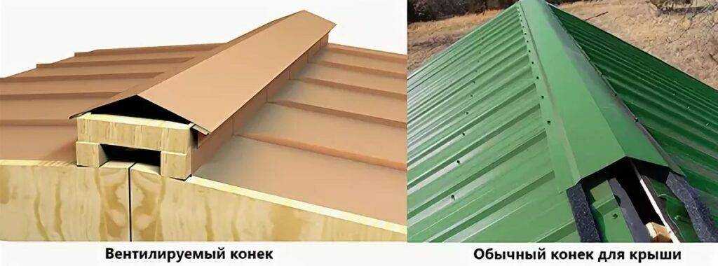 Правильно выполненная вентиляция позволит избежать на долгое время конденсата, тем самым увеличит сроки эксплуатации крыши из профнастила. Она состоит из следующих элементов: