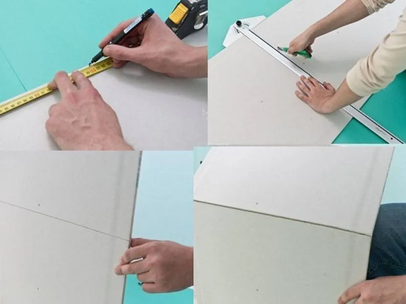 Лист гипсокартона представляет собой «сэндвич» из двух картонных стенок с гипсовым наполнителем. Чтобы разделить его на части, нужно в первую очередь разрезать картон, и потом надломить его.