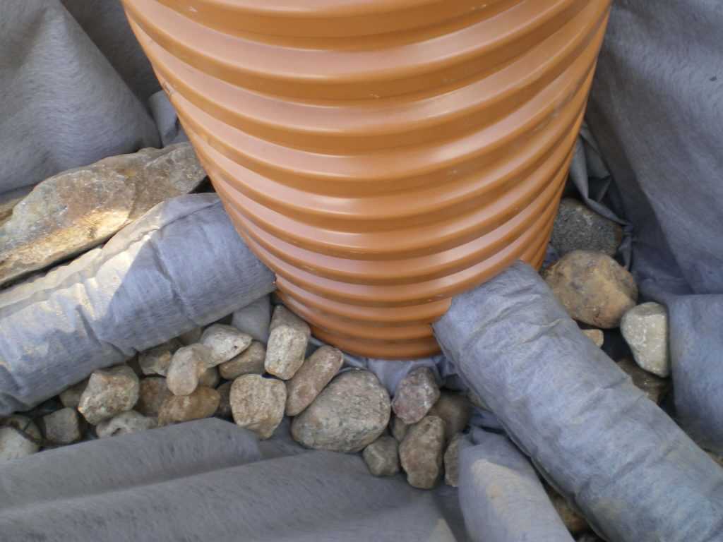 Применение фабричных труб для дренажа участка в обмотке из геотекстиля ускоряет выполнение монтажных операций, упрощает поддержание высокого качества