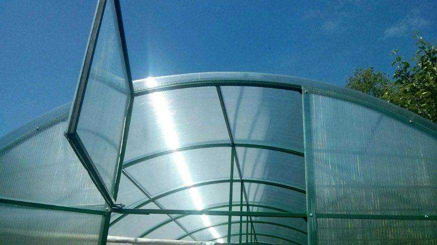 Покрытие может быть из закаленного стекла или плотной пленки в несколько слоев. Но более качественным признан поликарбонат. Он легко принимает нужную форму, режется и может служить несколько лет. При этом материал отлично пропускает солнечные лучи.