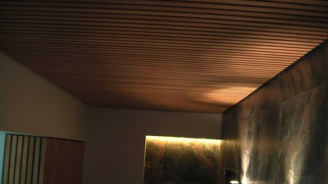 К преимуществам относят вариабельность применения – можно сочетать разные ламели и создавать узорные потолки. Выпускается гладкая рейка с идеальной шлифовкой, а можно подобрать текстурные варианты. Монтаж осуществляется на саморезы или посредством замкового соединения шип-паз. Крепление на обрешетку, декорировать можно лаками, тонировочной пропиткой или красками на водной основе.