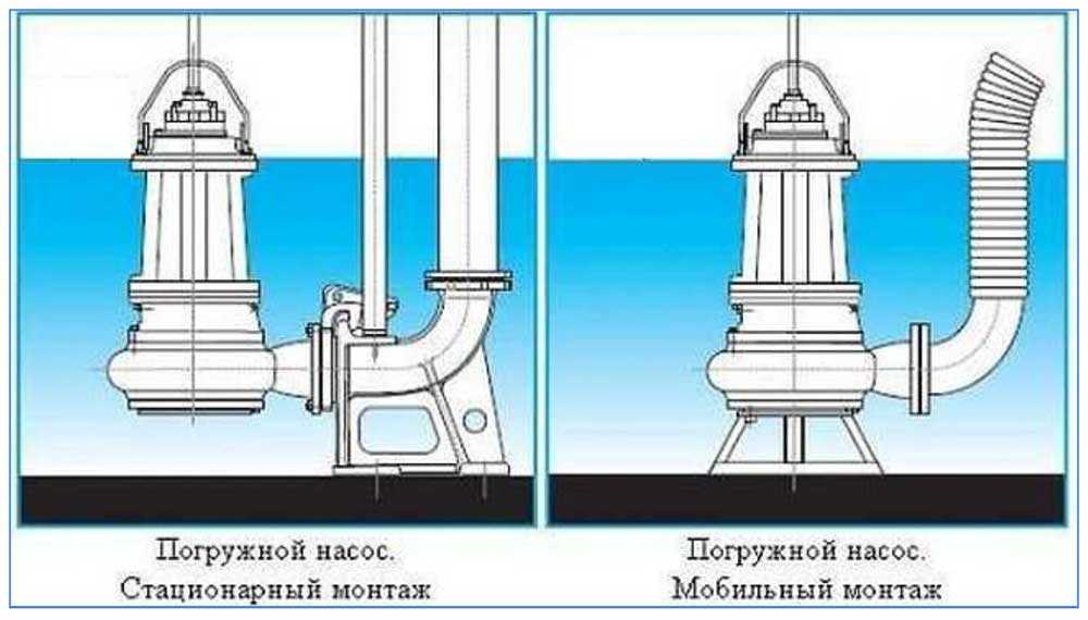 Их монтаж предполагает обустройство «посадочного места», оборудованного металлическими направляющими, позволяющим располагать насос в нужном направлении. Для спуска агрегата предусмотрен канат или прочный трос. Насос просто погружают по направляющим, «усаживая» на патрубок.