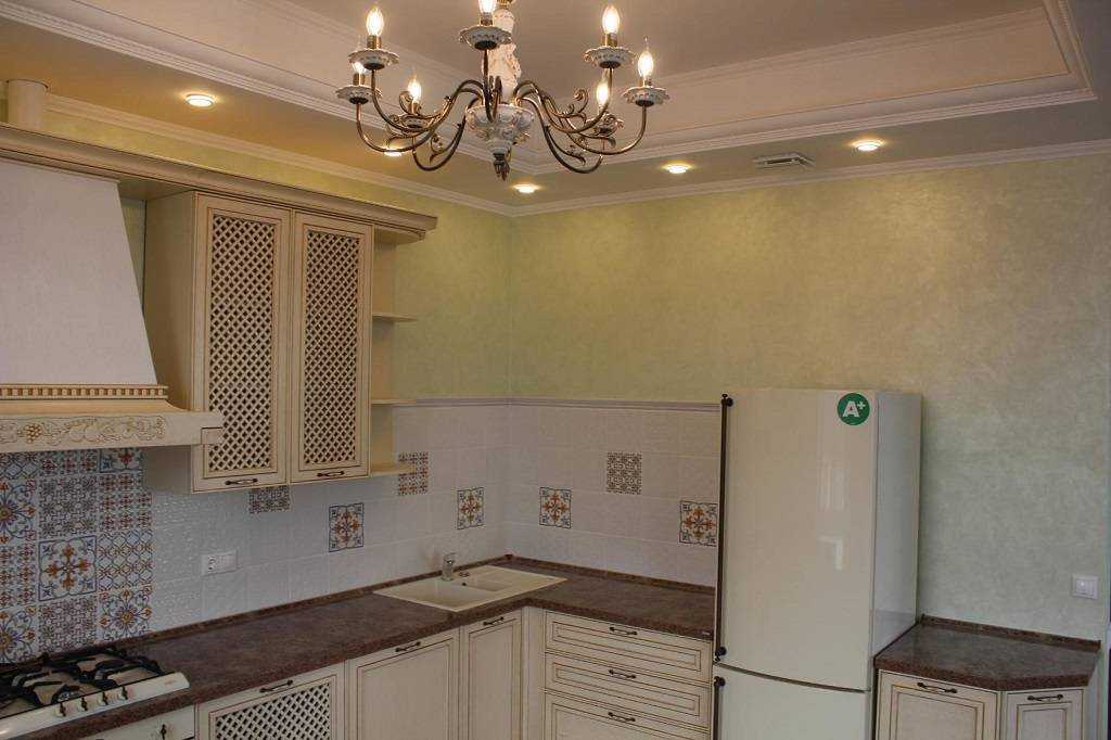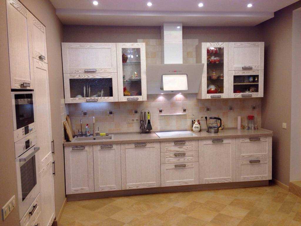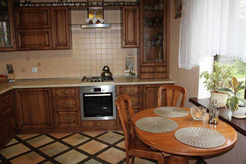 Кухонное пространство в романтической классической или прованской стилистике отлично дополнит светлая отделка, которая будет сливаться с гарнитуром и создавать в помещении нежную и утонченную обстановку. Красиво выглядят натуральные бежевые, серые или светло-коричневые расцветки.