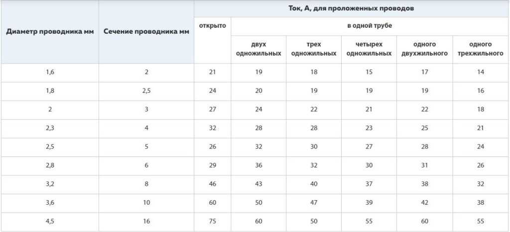 Упростить задачу по расчету сечения проводов поможет приведенная ниже таблица.
