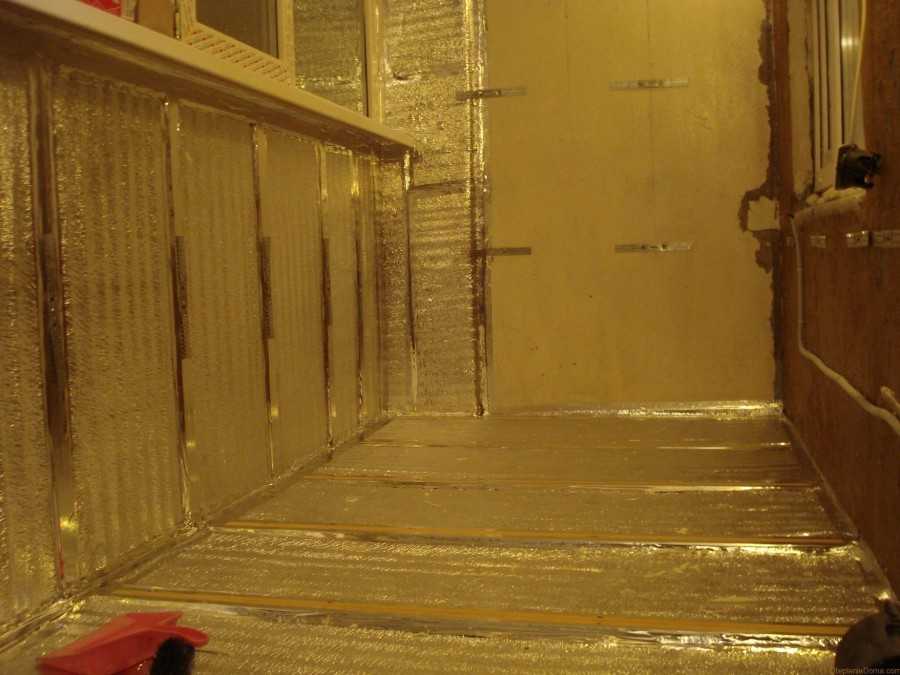 Пятый этап – гидроизоляция. В качестве материала можно взять полиэтиленовую пленку или пенофол. Последний обеспечит лучшую теплоизоляцию в том случае, если сторону с фольгой разместить внутрь балкона. Фрагменты пенофола нужно тщательно подгонять друг к другу и крепить с помощью специального фольгированного скотча. Полиэтиленовую пленку не обязательно подгонять можно сразу приобрести цельные куски, подходящие по размеру. Если же фрагменты недостаточно большие, она может монтироваться и внахлест. Места стыков заклеивают фольгированным скотчем.
