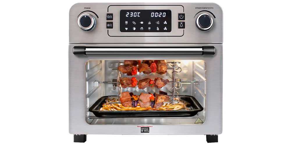 На втором месте — GFGRIL GFAO-700. Это более компактная по габаритам печь обладает небольшой по объему камерой – 23 л. Она оснащена электронным управлением, дисплеем и автоматическими программами. Выделяется эта модель намного большей функциональностью. Она может работать как духовка — с разными видами нагрева (верхний, нижний), позволяет готовить птицу и другие продукты на вертеле с электроприводом, в т. ч. на гриле, а также есть у нее функция аэрогриля для готовки различных полезных блюд. Встроенный вентилятор аэрогриля работает по технологии Rapid Air Circulate System, которая отвечает за оптимальную циркуляцию горячего воздуха. Эту функцию можно использовать для жарки, выпечки и запекания с эффектом гриля. Скорость работы вентилятора можно регулировать в двух положениях.