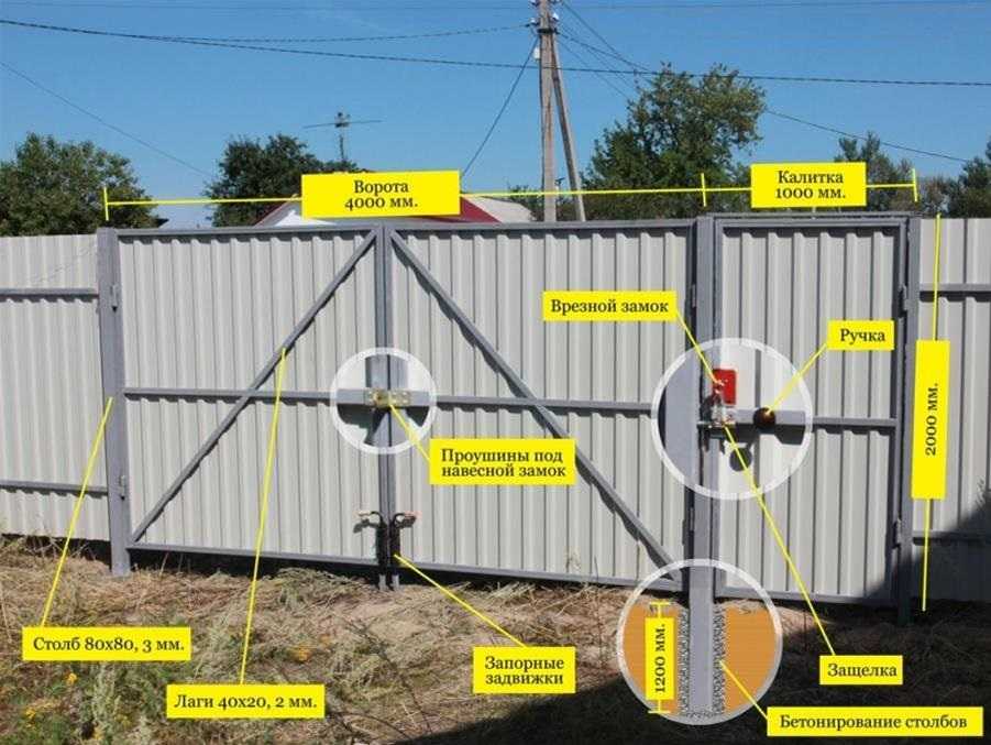 Калитка устанавливается между двумя опорными столбами Простое изготовление калитки из профнастила позволяет уделить максимум времени на придание конструкции эстетичного вида. Не рекомендуется делать двойные створки. При отсутствии листа нужных размеров в одном магазине ищите материал в другой торговой точке, в т. ч. если дверь 2 метра в высоту.