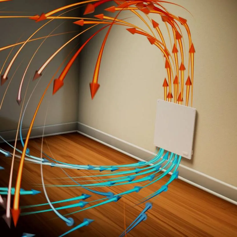 Суть механизма действия конвектора основан на создании и распределении им тепловых воздушных потоков. Холодный воздух, поступая через нижние воздухозаборные отверстия, соприкасается с ТЭН-ом, нагревается, поднимается и поступает через верхние выходные отверстия в помещение. Далее нагретый воздух распределяется по комнате.