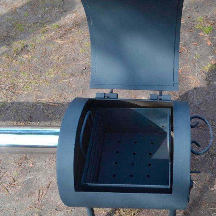 Нельзя использовать лишь пластмассу. У бочки снимают дно для свободного прохождения дыма. В нижней ее части нужно сделать отсек, куда будут укладываться дрова. Здесь понадобятся петли, на которые будет надета дверка. Так отсек сможет закрываться.