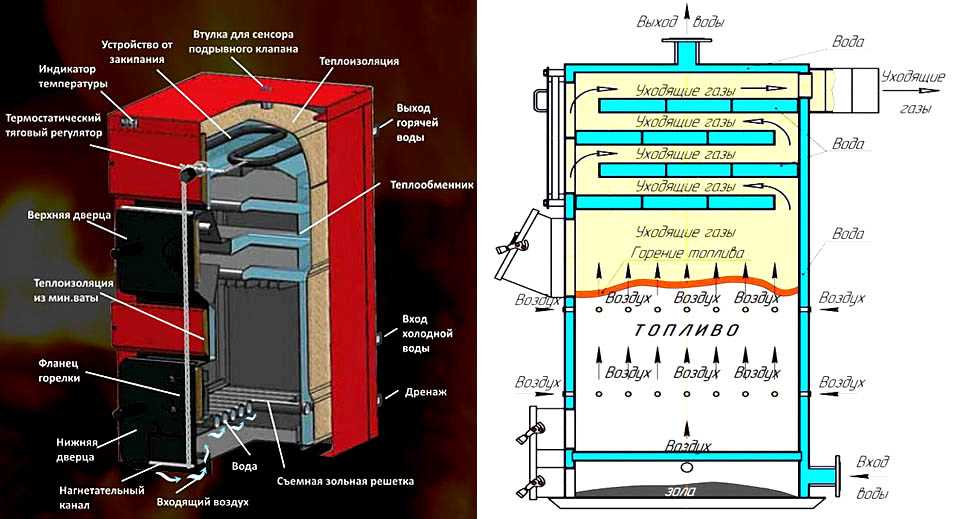 - С традиционным сжиганием снизу-вверх, топливо в которых поджигается снизу, а горячие продукты сгорания проходят через всю камеру сгорания и удаляются в дымовую трубу в верхней ее части, по пути нагревая теплоноситель в теплообменнике, которым являются сами стенки камеры и, возможно, дополнительные регистры;