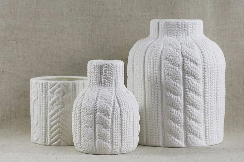 Банки, бутылки, коробки, подсвечники и вазочки часто одевают в узорчатые чехлы. Стили прованс и ретро прекрасно подходят для такого декора. Обычная банка превратится в настоящее украшение интерьера, если связать для нее чехольчик с откидным воротником. Интересно выглядит сочетание коробок разного размера, которые оформлены вязаными изделиями в различных техниках. Ажурные чехлы на подсвечниках будут мягко рассеивать свет, что послужит отличным дополнением к романтической атмосфере. Сами свечки также могут быть украшены узорчатыми изделиями. Особенно актуальными такие композиции будут на праздниках и торжествах.