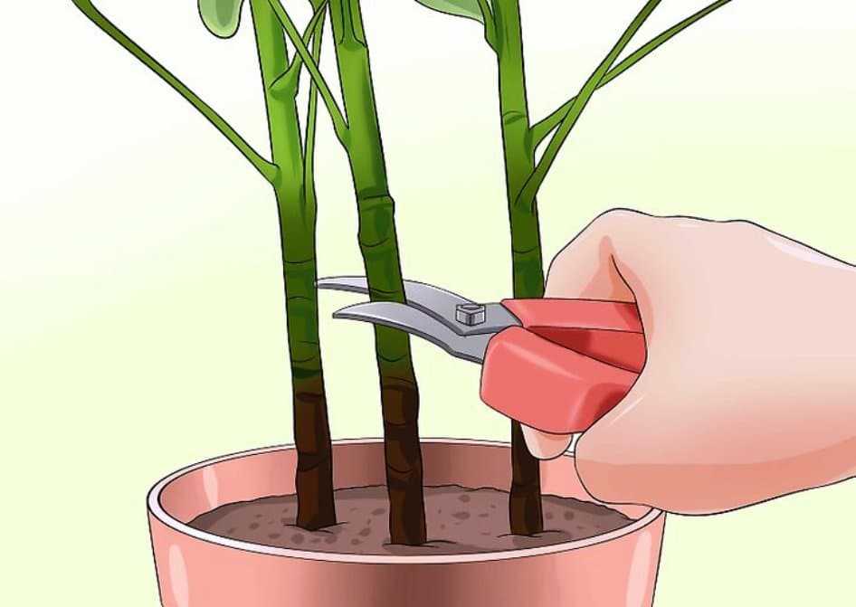 Большинство домашних растений периодически обрезают для удаления больных, загущающих, слишком длинных или утративших листья побегов, отцветших соцветий. Прищипка верхней точки роста способствует появлению боковых ростков и большего количества листьев. Укорачивание ветвей примерно на ⅓ придает кусту аккуратную форму и более густую крону. Некоторым видам, легко переносящим обрезку, делают декоративную «стрижку» в виде геометрической фигуры, животного или красивого предмета.
