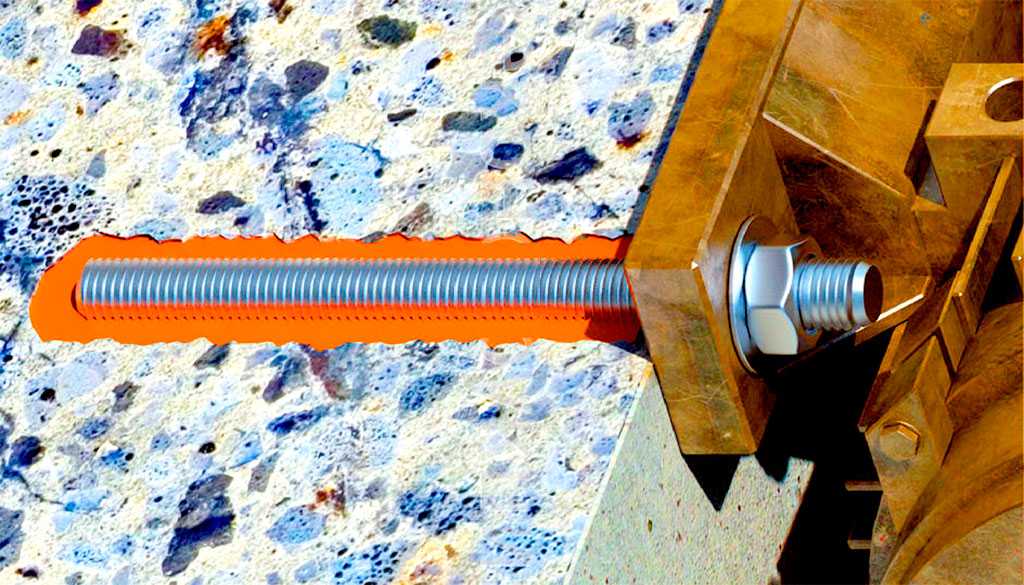 - В отверстие вставляется анкерный болт длиной не менее 500 мм и резьбой М12 или М14.