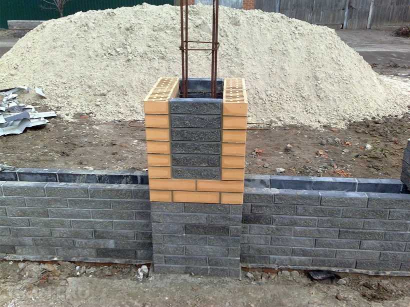 Далее выкладываются кирпичи. Итак, чередуя слои, строится весь забор. Чтобы он был прочным кладка должна осуществляться по всему периметру сразу ряд за рядом.