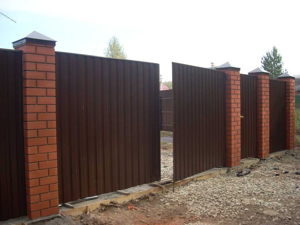 Профилированный лист под дерево универсален. Он хорошо смотрится в сочетании с другими материалами, включая кирпич, камень и даже стальную ковку. На основных вариантах конструкции ограждений остановимся подробнее.