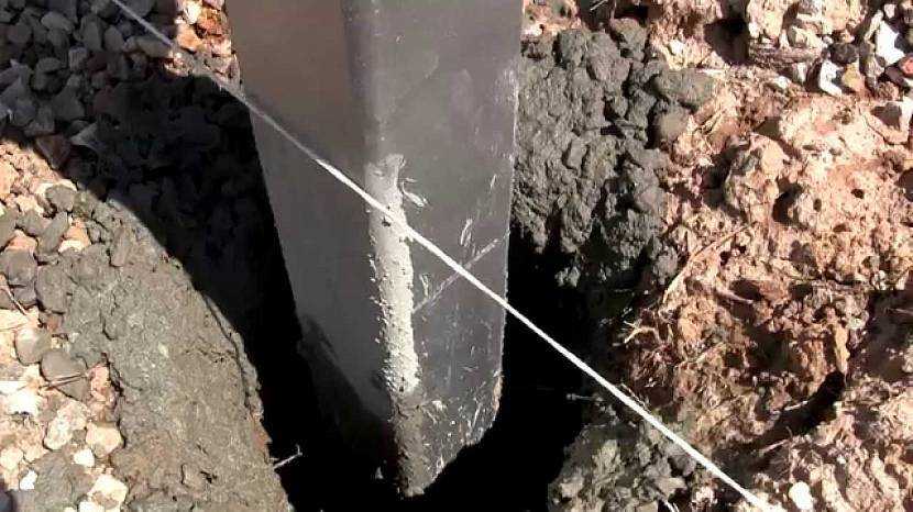 При бетонировании столбов необходимо контролировать и линию их установки по натянутому шнуркуИсточник ytimg.com