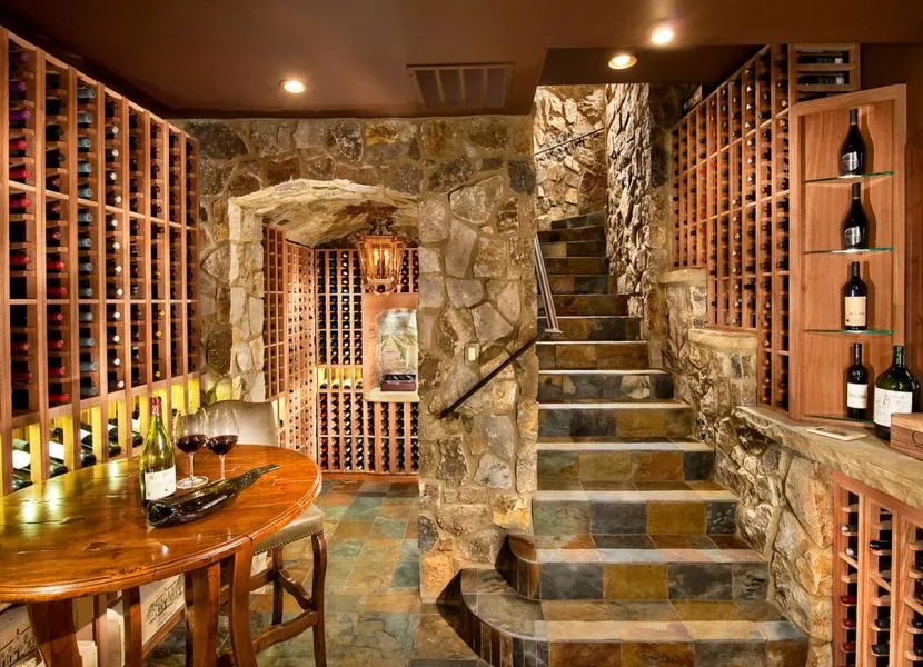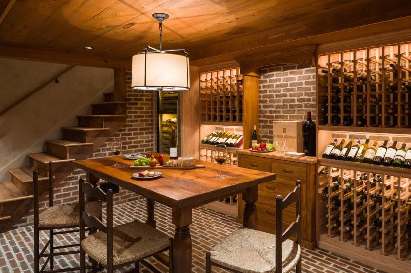- Для ценителей хорошего вина в подвале частного дома можно обустроить специальный винный погребок с большим количеством стеллажей и деревянными кадками.