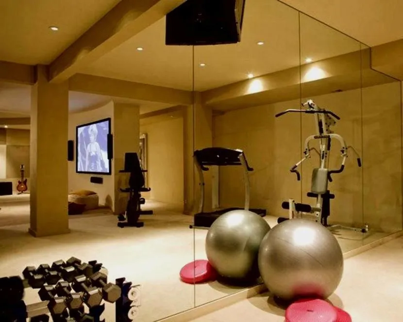 Тренажёрный зал. Для комфортных занятий спортом зал оснащают хорошей вентиляцией, пол делают особо прочным, выбирают лампы в теплом солнечном спектре. Хорошим дополнением станет большое зеркало и душевая.