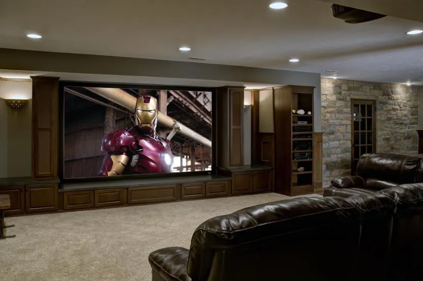 Домашний кинотеатр. Подвал отличается хорошей звукоизоляцией, поэтому цокольный этаж – оптимальное место для размещения необходимого оборудования. В дизайне полезно предусмотреть небольшой бар и холодильник с напитками. Для оформления кинотеатра выбирают любой стиль, главное – удобная мебель.