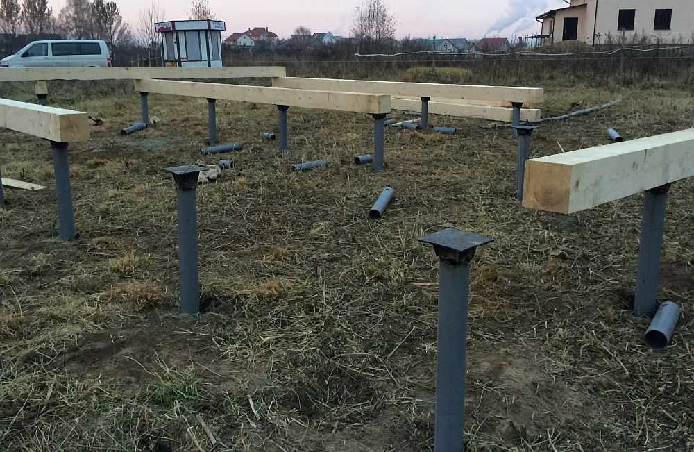 Действие №1. На винтовые сваи привариваются оголовки параметрами 20Х20 см. на которые стелиться гидроизоляция. Она поможет избежать лишенного скопления влаги между металлом и деревом. В оголовках необходимо сделать 4 отверстия, которые необходимы для последующего крепежа балок к сваям. Действия №2. Укладывается первый ряд брусьев. При укладке используется два типа «лапа в лапу» или «в пол». После чего выполняется выравнивание будущей конструкции по диагонали с помощью рулетки и веревки. Действие №3. Осуществляется крепление брусьев к оголовкам шурупами. Для этого используются шурупы диаметром 8-10 мм, а длина их должна быть 150 мм. Также можно использовать анкерные болты диаметром 16 мм. Но предварительно необходимо выполнить подготовительные отверстия в брусьях. Глубина отверстий не должна превышать ¾ длины шурупа. Это поможет избежать растрескивания дерева