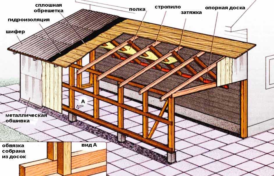Чтобы понять, как сделать односкатную крышу на гараже, необходимо разобраться с ее устройством. Вся конструкция обычно состоит из таких важных и дополняющих друг друга элементов: