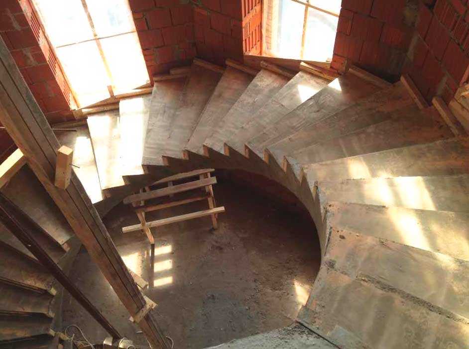 Криволинейные пролеты отличаются высокой трудоемкостью в изготовлении. Связано это с изготовлением радиусной опалубки и трудностью монтажа ее сегментов. Однако такая форма позволяет экономить свободное пространство. При этом криволинейная бетонная лестница может быть: