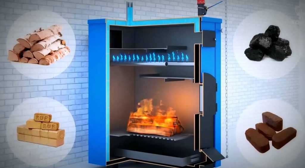 Агрегат удобно использовать, т. к. после загрузки можно долго не открывать топку. В процессе перегорания дров или угля выделяется горючий газ, который собирают в камере, где он догорает и выделяет энергию.