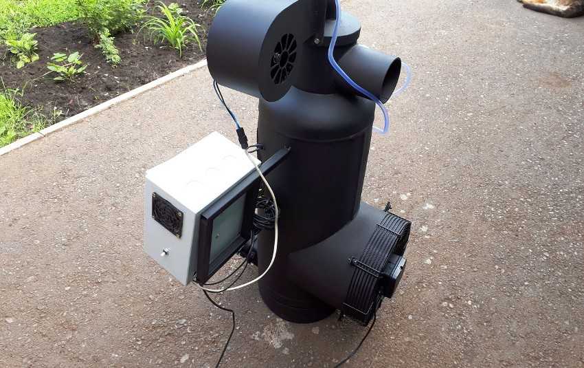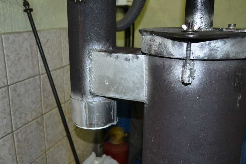 Для подачи кислорода используется труба длиной около 37 см и диаметром 100 мм. В ней по всей длине элемента выполняются отверстия, необходимые для поступления кислорода. Труба приваривается перпендикулярно крышке в нижней части аппарата. На ней фиксируется воздушная заслонка, которая будет крепиться с помощью заклепки или болтов. Отверстие под заслонкой должно быть размером 6 см. Оно предназначено для подачи масла и разжигания топлива.