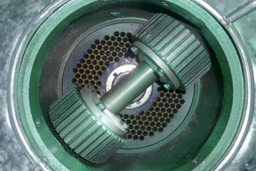 Вал электрического двигателя соединяется с вертикальным штоком, приводящим во вращение матрицу.