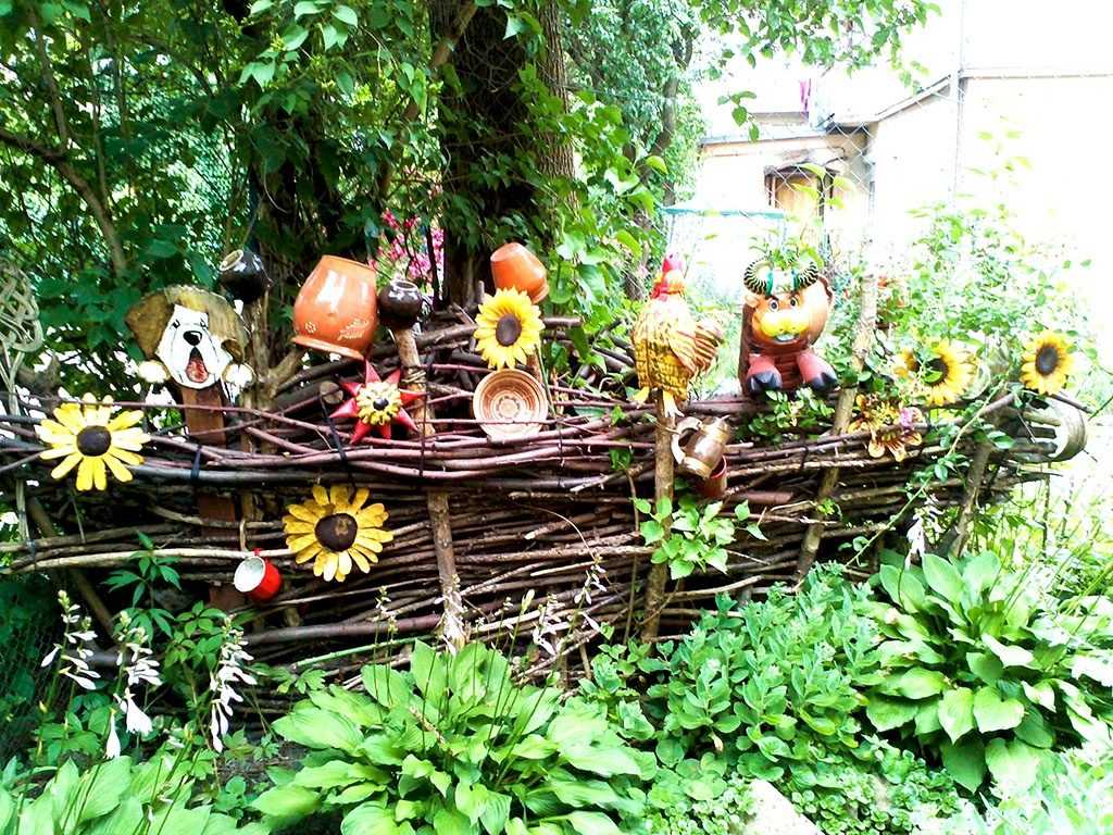 Плетень можно украсить глиняными горшками, декоративными растениями и цветами