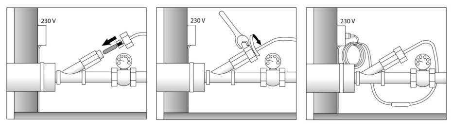 При наружном монтаже греющего кабеля есть два способа — это укладка «волной» («спиралью») или вдоль трубы. Независимо от способа он укладывается по всей длине. Более высокая концентрация укладки должна соответствовать местам с повышенной вероятностью замерзания. Далее он выводится в теплое место, а только потом производится электрическое подключение.