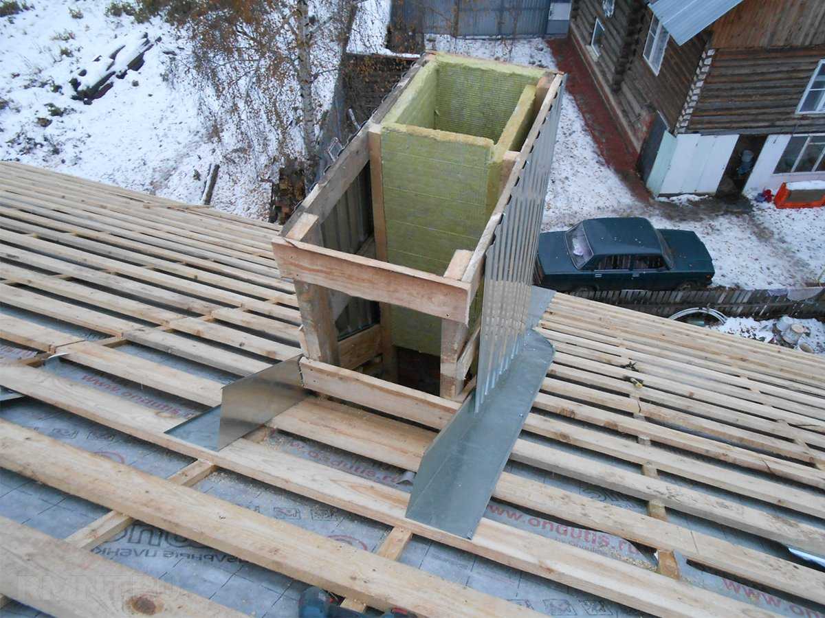 Деревянная стропильная система и некоторые слои кровельного пирога (гидроизоляция, пароизоляция) не выдерживают нагрева и могут воспламениться либо оплавиться. Безопасность элементов системы, не отличающихся огнестойкостью, обеспечивается за счет монтажа специального короба по периметру отверстия в кровле.