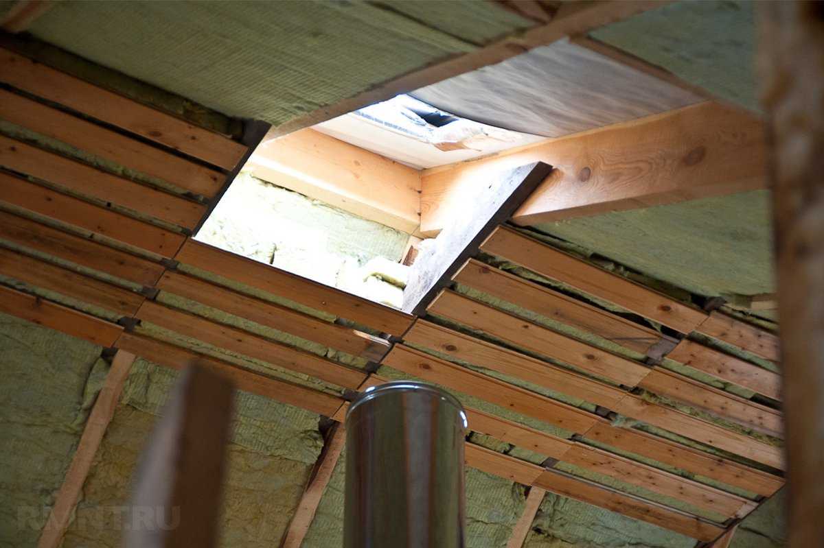 Проход через крышу печной трубы предусматривает термоизоляцию дымохода базальтовой ватой или другими негорючими материалами. По возможности между слоем утеплителя и самим дымоходом оставляют воздушный зазор шириной 5–7 см.