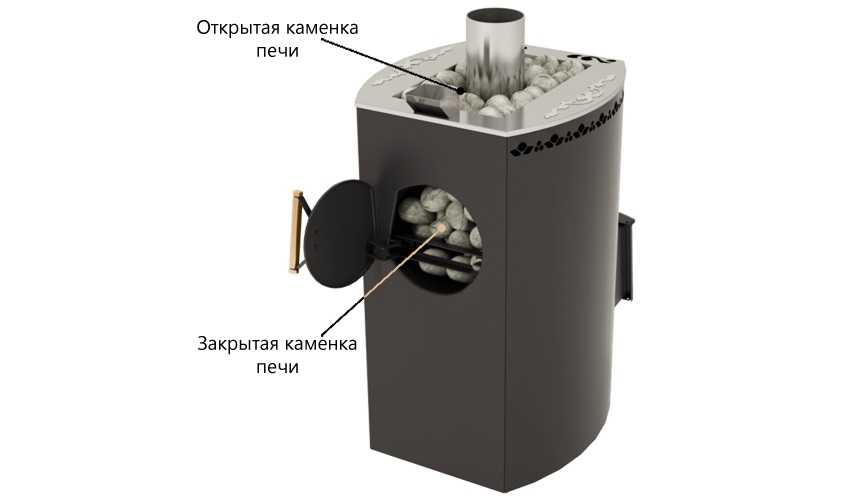 Закрытая каменка требует более длительного нагрева. Она не отдает тепловую энергию в помещение, что увеличивает длительность нагрева бани до нужного значения. Однако подача пара не слишком влияет на степень нагрева — камни расположены в закрытом отсеке, откуда тепловая энергия практически не выводится.